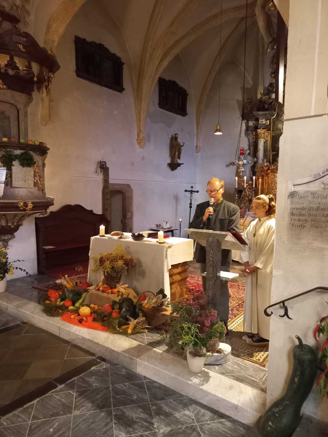 Fleißige Frauen und Männer hatten die Kirche wunderschön geschmückt. Dies war heuer schwierig, da der Hagel im Juni schwere Schäden an den Früchten und Gebäuden angerichtet hatte.