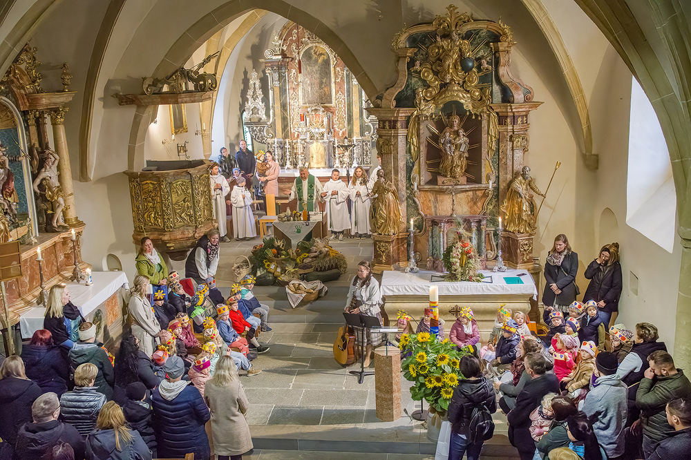 Trotz des schlechten Wetters und der beengten Verhältnisse in der Kirche feierten wir mit unserem Herrn Pfarrer einen würdigen Erntedank. Dank der Bauernschaft und des Obstbau- und Bienenzuchtvereins wurde der Altartisch reichlich mit Erntegaben geschmückt. Beim Einzug der Ministranten, Priester und der Kindergartenkinder mit der Erntekrone spielte ein Bläserquartett unseres Musikvereines. Die musikalische Gestaltung des Gottesdienstes übernahmen die Kindergartenkinder und das Bläserquartett. Frau Köppel berichtete in berührenden Worten über das Bauernjahr. Schwerpunkt des Gottesdienstes war der Hinweis auf die Schöpfungsverantwortung des Menschen und auf den achtsamen Umgang mit der Natur. Das Opfergeld wird für Notleidende in der Steiermark an die Caritas weitergegeben, und mit dem Erlös aus den Erntegaben kommt einem guten Zweck zugute. Ein großer Dank gilt auch allen, die für die anschließende Agape, sowie als Helfer zum Gelingen des Festes einen Beitrag geleistet haben.