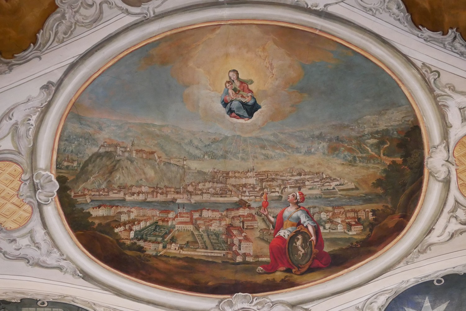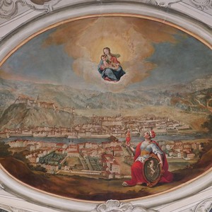 Die insgesamt 15 Deckenbilder zeigen in der Gewölbemitte drei große Szenen: im Norden die brennende Stadt Pettau (Ptuj) im heutigen Slowenien, im Süden eine Pestheilung in Graz mit der Ansicht des dortigen Hauptplatzes und im Zentrum die Darstellung des Gnadenbildes Mariahilf, als Stadtmutter über Graz schwebend. Die im Vordergrund kniende Gestalt ist die Personifikation der Steiermark mit Herzogshut und dem Landeswappen mit dem steirischen Panther, die der Gottesmutter ein brennendes Herz entgegenhält. Im linken Drittel des Bildes sind am rechten Murufer die Doppeltürme der Mariahilfkirche zu erkennen.