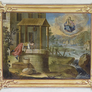 Bemerkenswert ist auch die Gestaltung des inneren Portalrahmens. Er zeigt in der Supraporte ein Ölgemälde, das sich auf die Gewährung eines vollkommenen Ablasses durch Papst Klemens XII. im Jahre 1739 bezieht, der links im Vordergrund zu sehen ist. Am rechten Bildrand stehen die Kirchenstifter Erzherzog Ferdinand III., der spätere Kaiser Ferdinand II., und Hans Ulrich von Eggenberg mit dem Bauplan der Mariahilfkirche. Über der im Hintergrund dargestellten Klosteranlage schwebt das Gnadenbild. Das Chronogramm in der Kartusche unter dem Bild ergibt die Jahreszahl 1771.