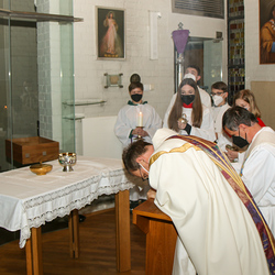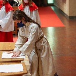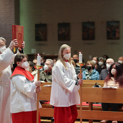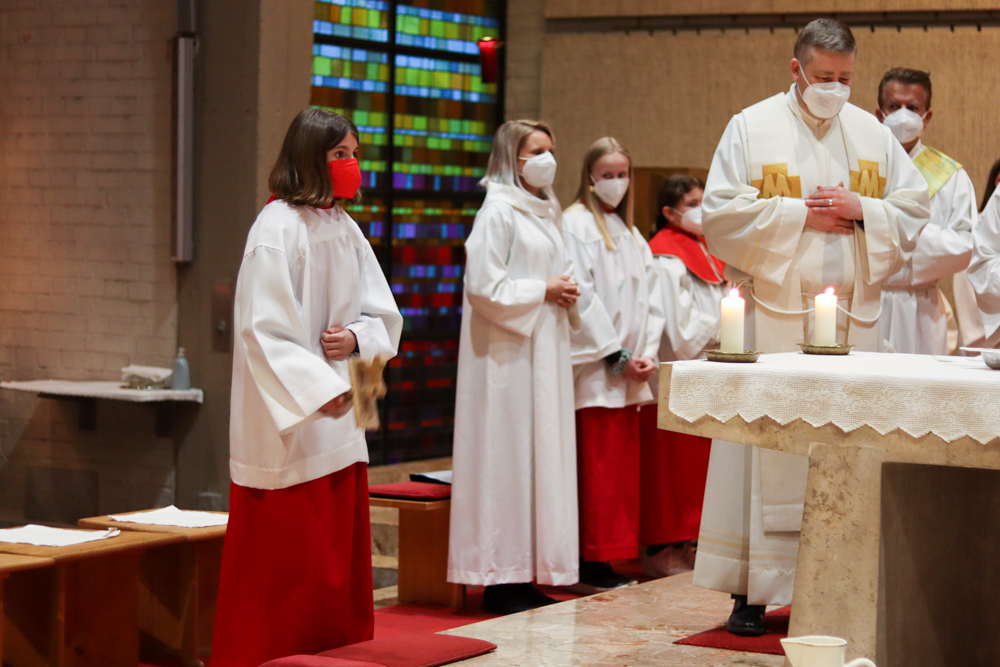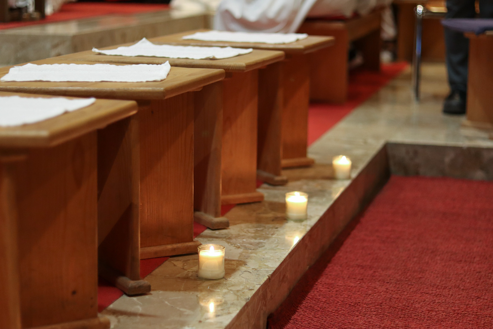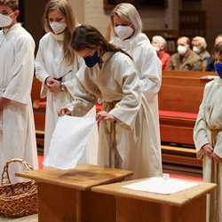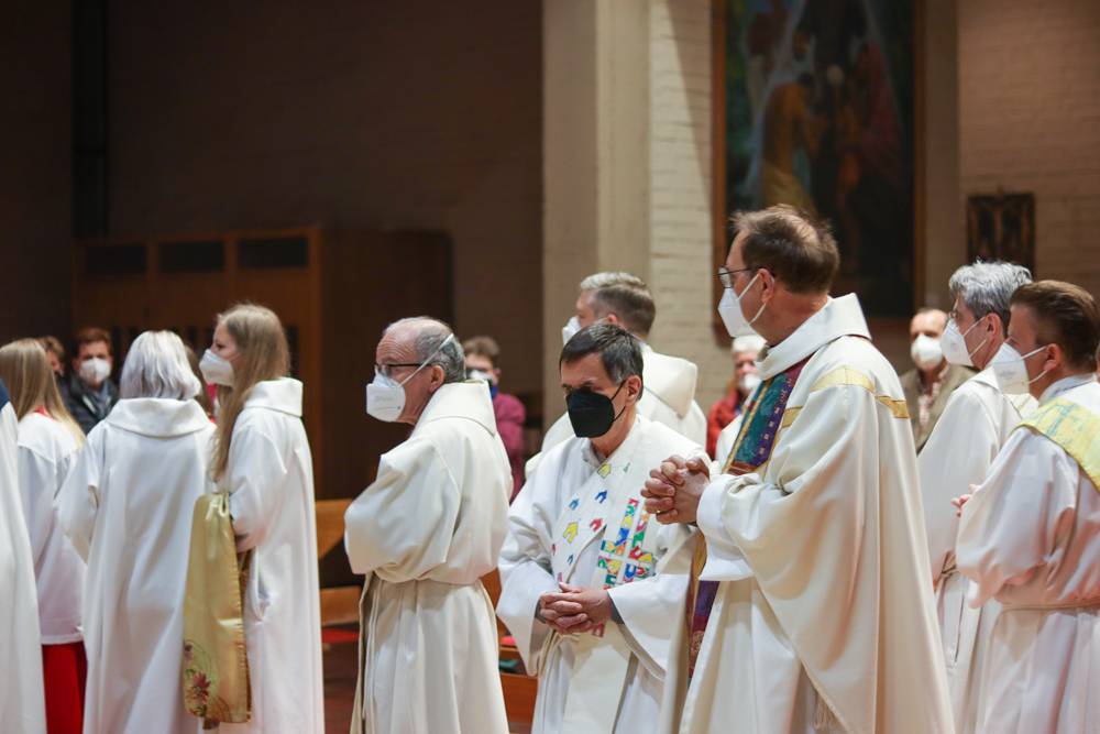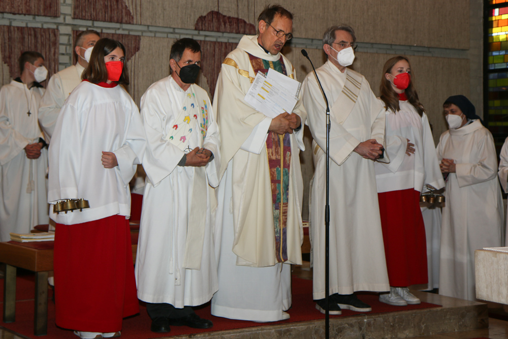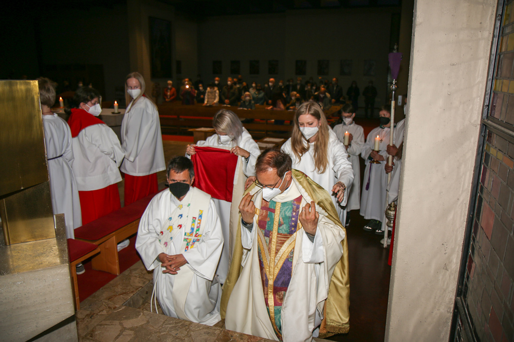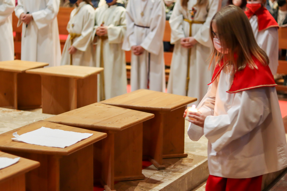 In einer etwas anders gestalteten Fußwaschung wurde jenen gedacht, die nicht oder nicht mehr am Leben der Kirche teilnehmen können oder möchten. Die Stühle blieben leer. Symbolisch für Rand- und Zielgruppen und jene Menschen, die unsere Gesellschaft mitprägen, wurden Kerzen entzündet. Als Zelebranten fungierten unsere drei Priester, drei Diakone sowie alle Pastoralreferentinnen und Referenten, welche den Sendungsauftrag im Seelsorgeraum Kaiserwald erfüllen.